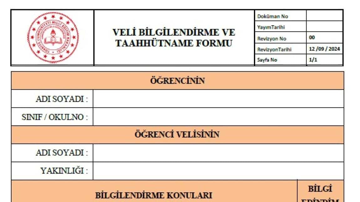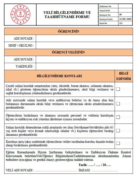 VELİ BİLGİLENDİRME VE TAAHHÜTNAME FORMU